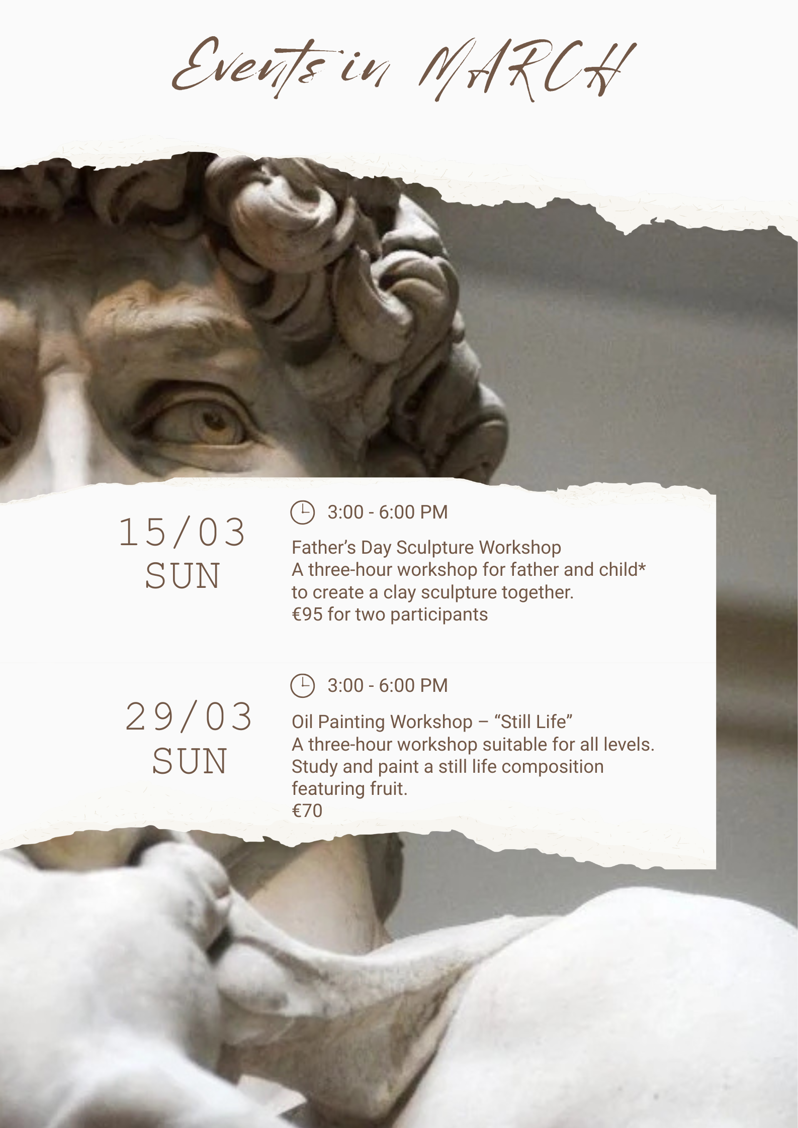 Each month, our calendar offers a variety of events: you can find painting workshops, sculpture courses, live drawing sessions, and various workshops. Each activity is designed to be fun and educational, allowing participants to explore different art forms and develop their skills.